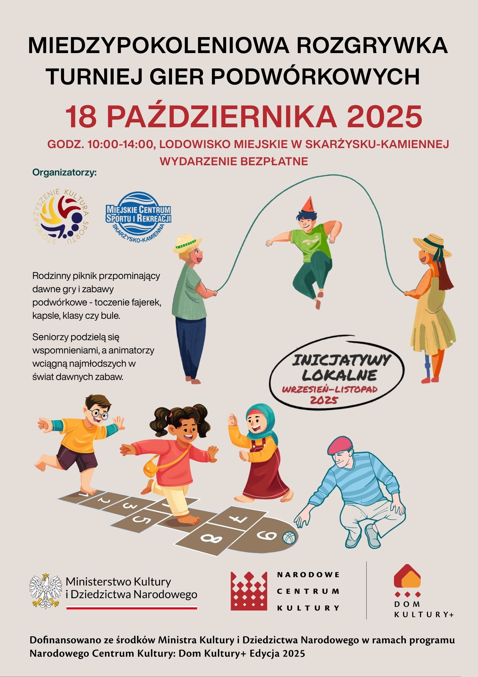 Miejskie Centrum Sportu i Rekreacji oraz Stowarzyszenie Kultura Sportu zapraszają na wydarzenie o nazwie Międzypokoleniowa Rozgrywka - Turniej Gier Podwórkowych, które odbędzie się 18 Października 2025r. w godzinach 10:00-14:00 na Lodowisku Miejskim w Skarżysku-Kamiennej.
